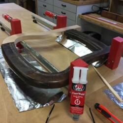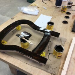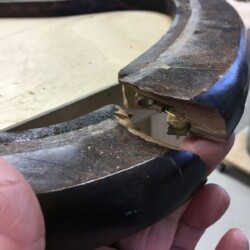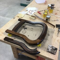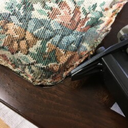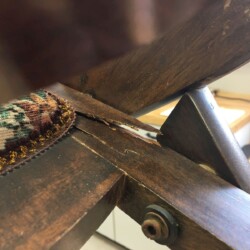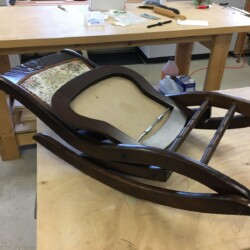 The next challenge became re-staining the seat frame to match the original finish, which was very dark. Several applications of penetrating stain simply wouldn’t darken the new maple side section enough. A Minwax Polyshades stain and varnish was used over the many coats of stain, until the entire seat frame finally matched the original finish. A pneumatic upholstery stapler and clear Gorilla glue were used to re-attach the original seat cushion and fabric. New and more substantial hardware was used to complete the reassembly, and the antique folding rocker folded and rocked once more!