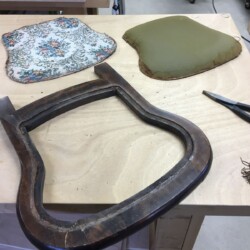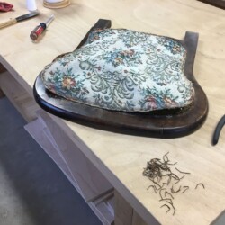 A call from a family member came in that a favorite antique folding rocker had been broken. Once I got the rocker into the workshop, getting the broken seat apart became the first challenge. The four pivot points were headed metal rods with hollow ends that had been swagged. The only way to remove them was to grind away the mushroomed ends. Trying to preserve the upholstery for re-use, I learned that it was not only stapled but also glued to the seat frame. With acetone, pliers, putty knife, and screw driver, the old glue was loosened, and about one million (an estimate) staples were removed.