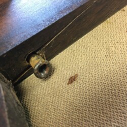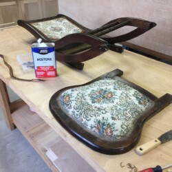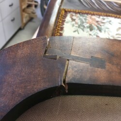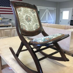 The next challenge became re-staining the seat frame to match the original finish, which was very dark. Several applications of penetrating stain simply wouldn’t darken the new maple side section enough. A Minwax Polyshades stain and varnish was used over the many coats of stain, until the entire seat frame finally matched the original finish. A pneumatic upholstery stapler and clear Gorilla glue were used to re-attach the original seat cushion and fabric. New and more substantial hardware was used to complete the reassembly, and the antique folding rocker folded and rocked once more!