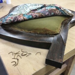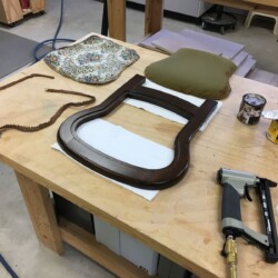 A call from a family member came in that a favorite antique folding rocker had been broken. Once I got the rocker into the workshop, getting the broken seat apart became the first challenge. The four pivot points were headed metal rods with hollow ends that had been swagged. The only way to remove them was to grind away the mushroomed ends. Trying to preserve the upholstery for re-use, I learned that it was not only stapled but also glued to the seat frame. With acetone, pliers, putty knife, and screw driver, the old glue was loosened, and about one million (an estimate) staples were removed.